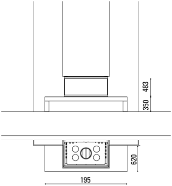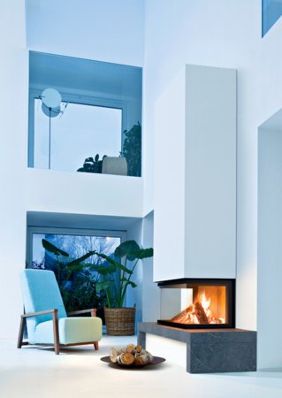 Kolmest küljest vaadeldav sileda Piasentina kivist riiuliga kamin. Südamiku servad on värvitud terasest äärisega.Vaata kasutatud südamiku tootelehte>