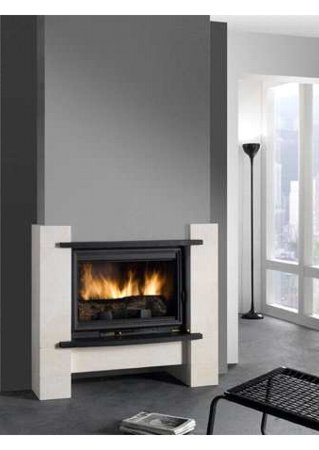 Kaasaegse välimusega kamin sirgele seinale. Kamin valmistatud kivist Estaillades ja riiulid mustast kivist.Koldena kasutatud malmist südamikku Chazelles C801L.