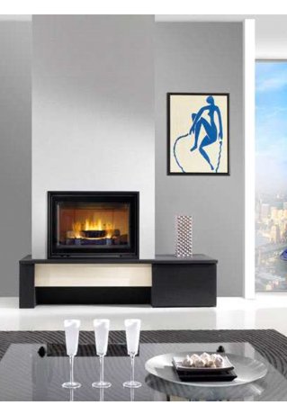 Kaasaegse välimusega kamin sirgele seinale. Kamin valmistatud kivist Estaillades ja mustast kivist. Südamiku ümber metallist raam.Koldena kasutatud malmist südamikku Chazelles HP800.