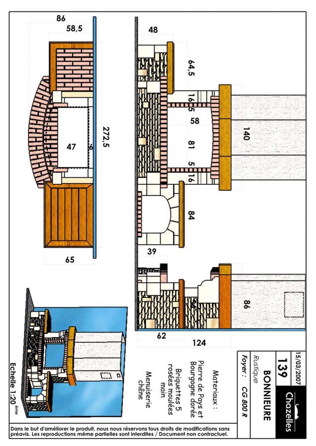 Maalähedase välimusega kamin sirgele seinale. Detaild valmistatud kivist Bourgogne Doree, dekoratiivtellisest. Komplekti kuulub tammest puitkarniis ja küljeriiulid.Koldena kasutatud malmist südamikku Chazelles CG 803 L. Kaminast võimalik ka avatud koldega versioon. Üldised mõõdud: 2730 x 840 x 1240 mm