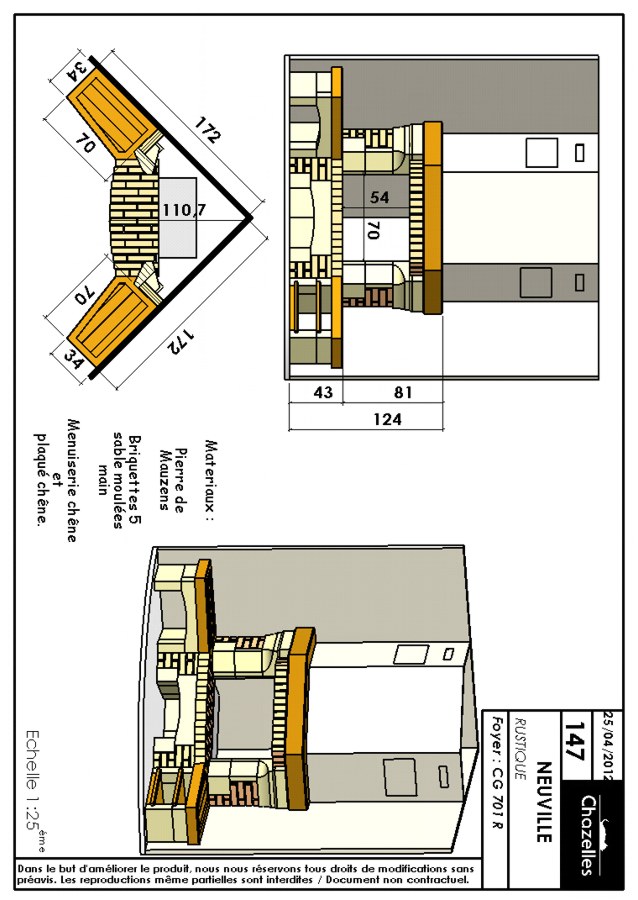 Maalähedase välimusega kamin nurka. Detaild valmistatud kivist Mauzens, dekoratiivtellisest.Komplekti kuulub tammest puitkarniis ja küljeriiulid.Koldena kasutatud malmist südamikku Chazelles CG 701 R.