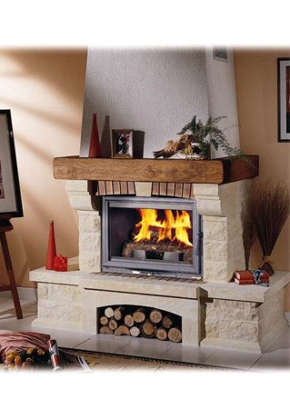 Maalähedase välimusega kamin sirgele seinale. Detaild valmistatud kivist Mauzens, dekoratiivtellisest.Komplekti kuulub tammest puitkarniis.Koldena kasutatud malmist südamikku Chazelles C 801 L. Kaminast võimalik ka avatud koldega versioon.
