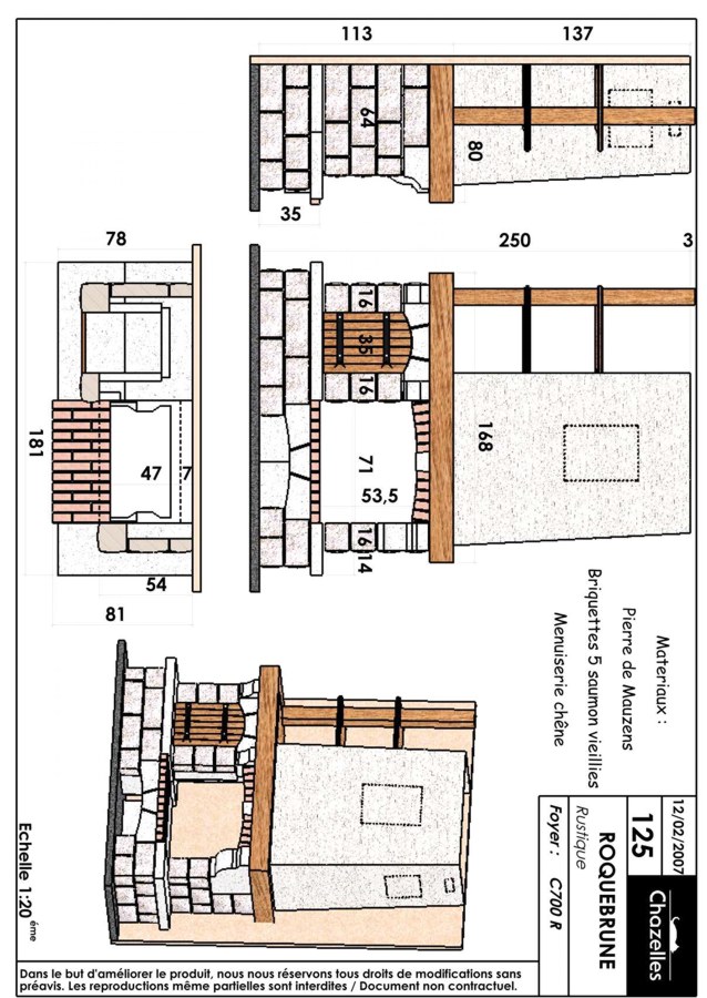 Maalähedase välimusega kamin sirgele seinale. Detaild valmistatud kivist Mauzens, dekoratiivtellisest. Komplekti kuulub tammest puitkarniis.Koldena kasutatud malmist südamikku Chazelles C 701 L. Kaminast võimalik ka avatud koldega versioon. Üldised mõõdud: 1800 x 810 x 2500 mm