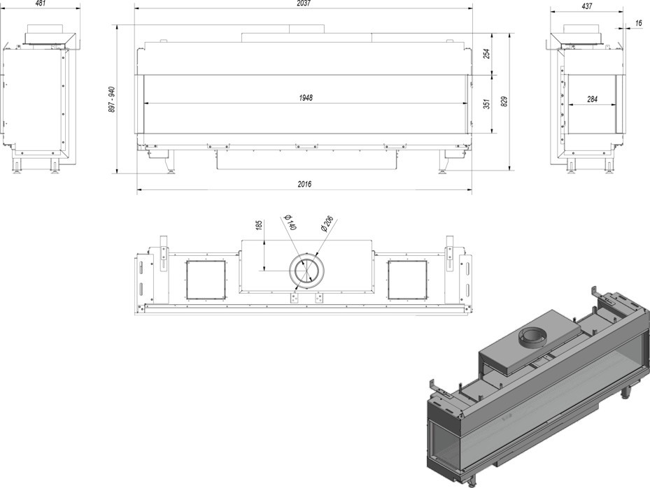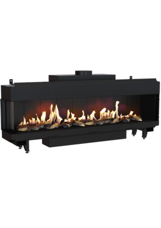 Horisontaalse kujuga gaasil töötav küljeklaasiga kaminasüdamik. Kaminasüdamikku saab kas parempoolse või vasakpoolse küljeklaasiga.