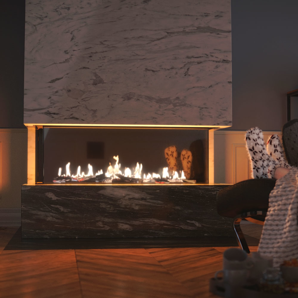 Horisontaalse kujuga gaasil töötav kahe küljeklaasiga kaminasüdamik.