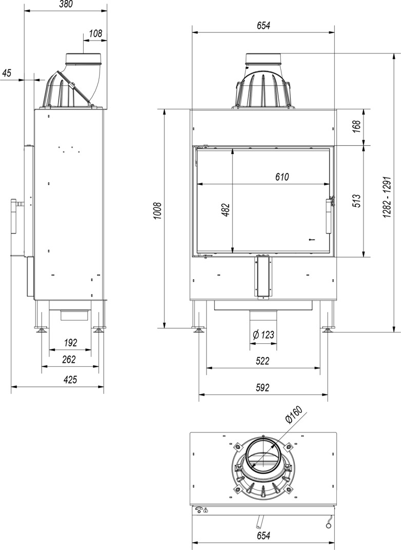 Südamik on varustatud reguleeritavate jalgadega, mis võimaldab toote lihtsat loodimist. Kaminasüdamik on varustatud välisõhuga ühendamise liitmikuga.