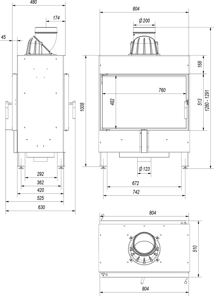 Südamik on varustatud reguleeritavate jalgadega, mis võimaldab toote lihtsat loodimist. Kaminasüdamik on varustatud välisõhuga ühendamise liitmikuga.