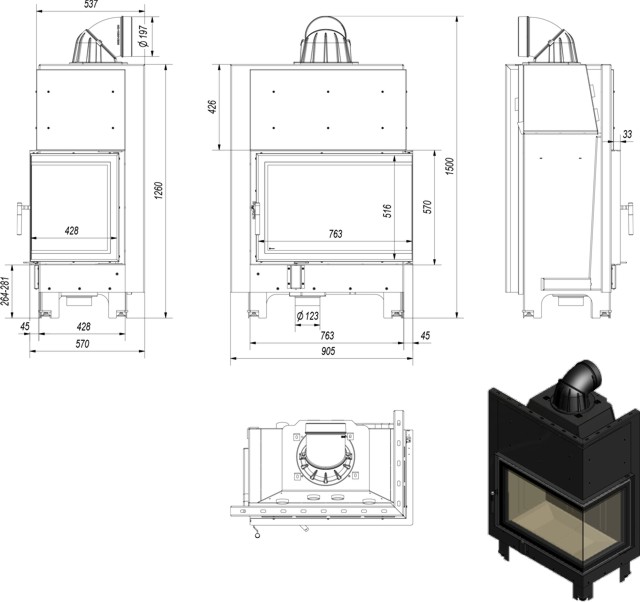 Terasest südamik küljele avaneva nurga klaasuksega. Kaminasüdamik on võimalik nii parempoolse, kui ka vasakpoolse küljeklaasiga. Kolle on vooderdatud tulekindla soojust salvestava materjaliga TERMOTEC. Südamik on varustatud reguleeritavate jalgadega, mis võimaldab toote lihtsat loodimist. Kaminasüdamik on varustatud välisõhuga ühendamise liitmikuga.