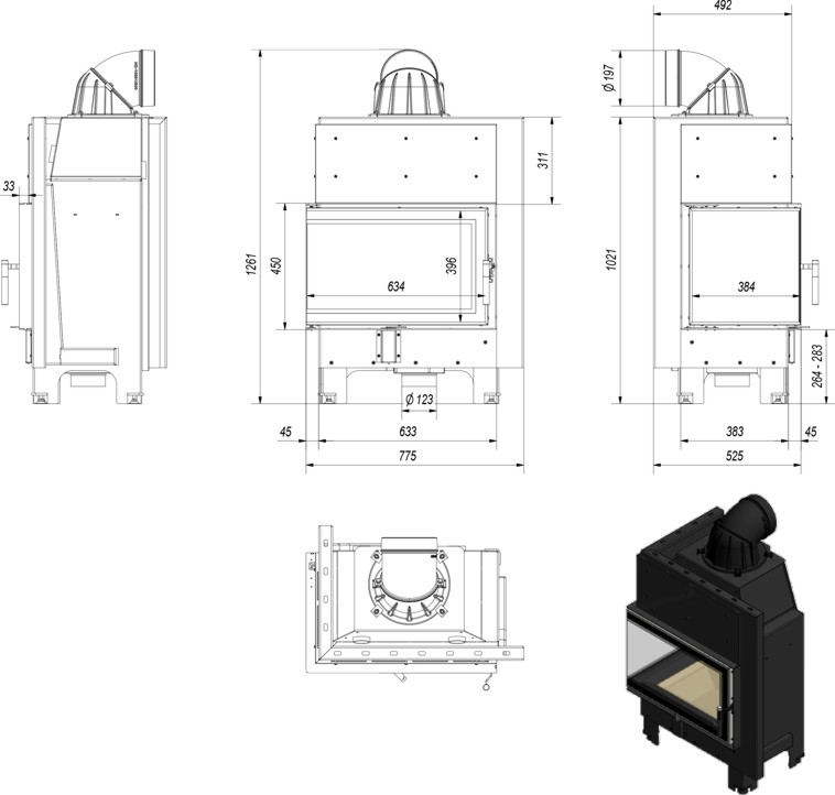 Terasest südamik küljele avaneva nurga klaasuksega. Kaminasüdamik on võimalik nii parempoolse, kui ka vasakpoolse küljeklaasiga. Kolle on vooderdatud tulekindla soojust salvestava materjaliga TERMOTEC. Südamik on varustatud reguleeritavate jalgadega, mis võimaldab toote lihtsat loodimist. Kaminasüdamik on varustatud välisõhuga ühendamise liitmikuga.