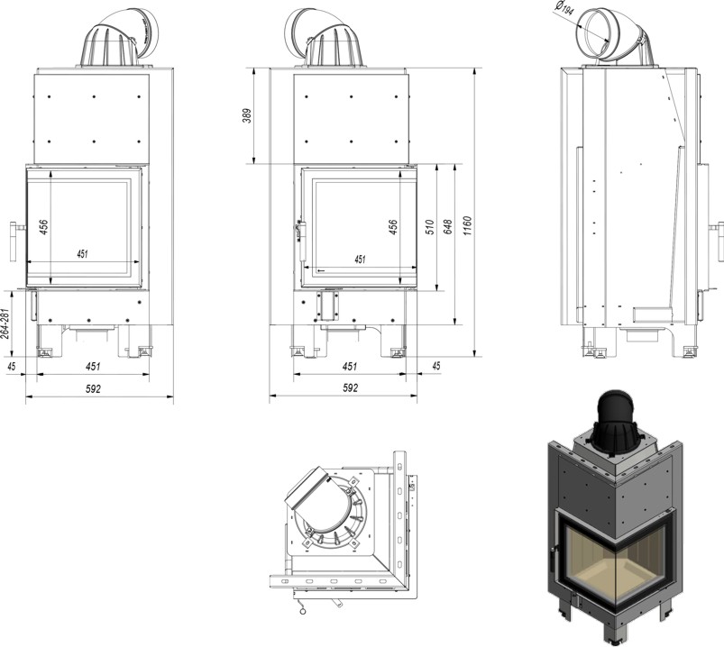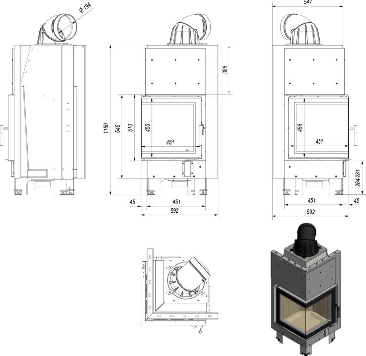 Terasest südamik küljele avaneva nurga klaasuksega. Kaminasüdamik on võimalik nii parempoolse, kui ka vasakpoolse küljeklaasiga. Kolle on vooderdatud tulekindla soojust salvestava materjaliga TERMOTEC. Südamik on varustatud reguleeritavate jalgadega, mis võimaldab toote lihtsat loodimist. Kaminasüdamik on varustatud välisõhuga ühendamise liitmikuga.