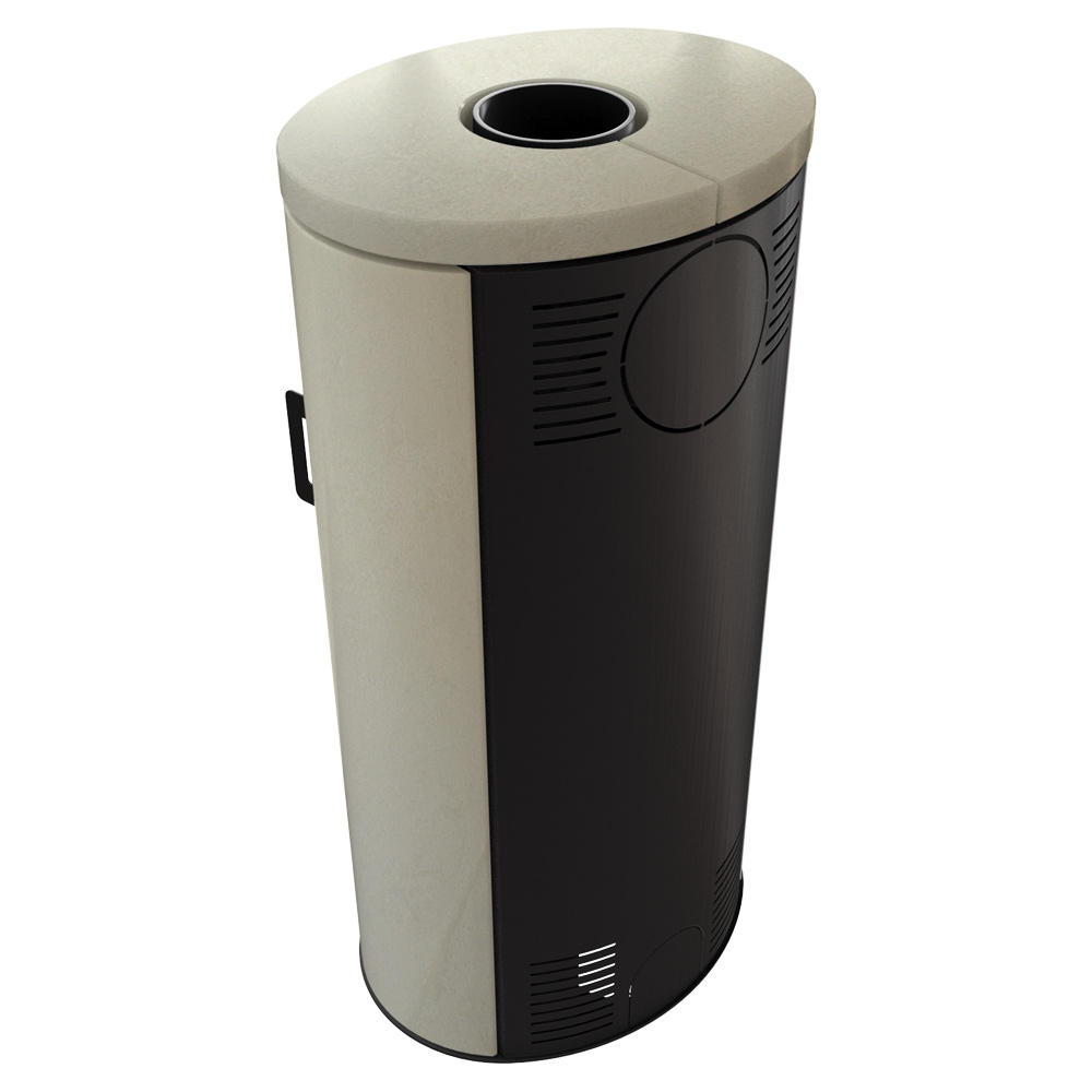 Terasest puuküttega kamin. Kolle on vooderdatud tulekindla soojust salvestava materjaliga ACUMOTTE.