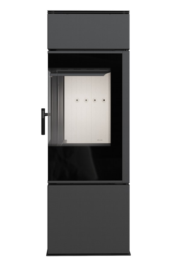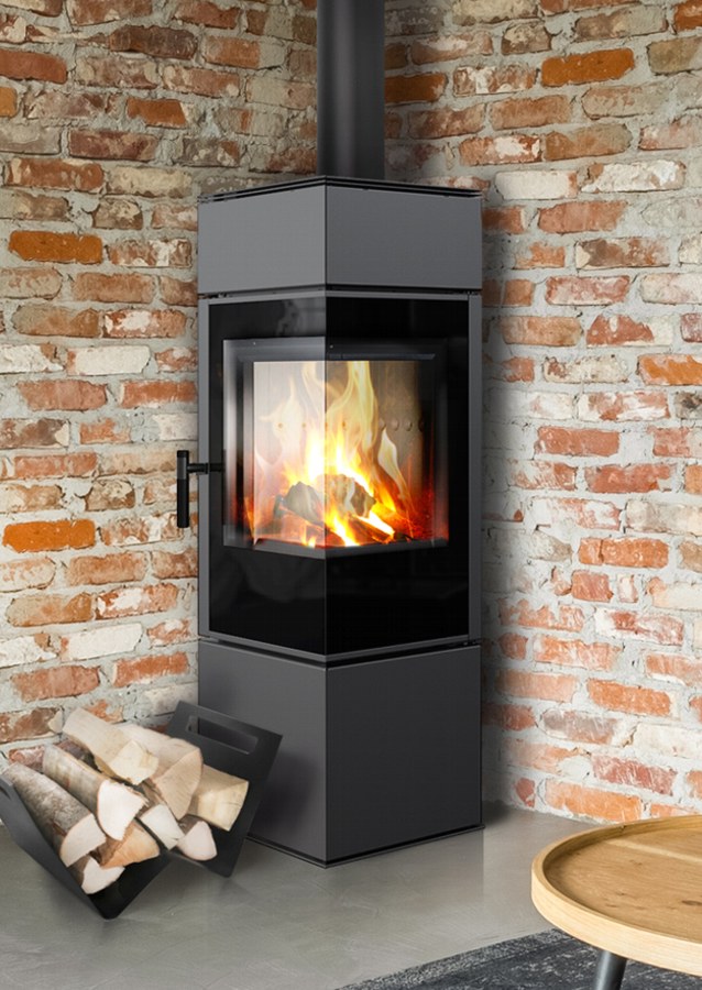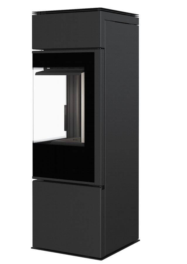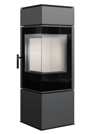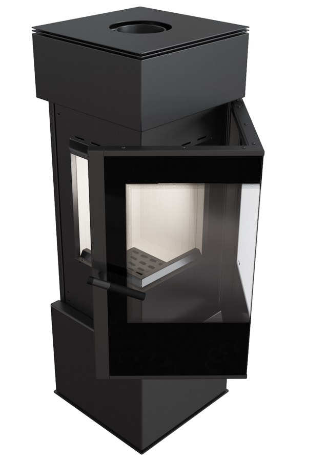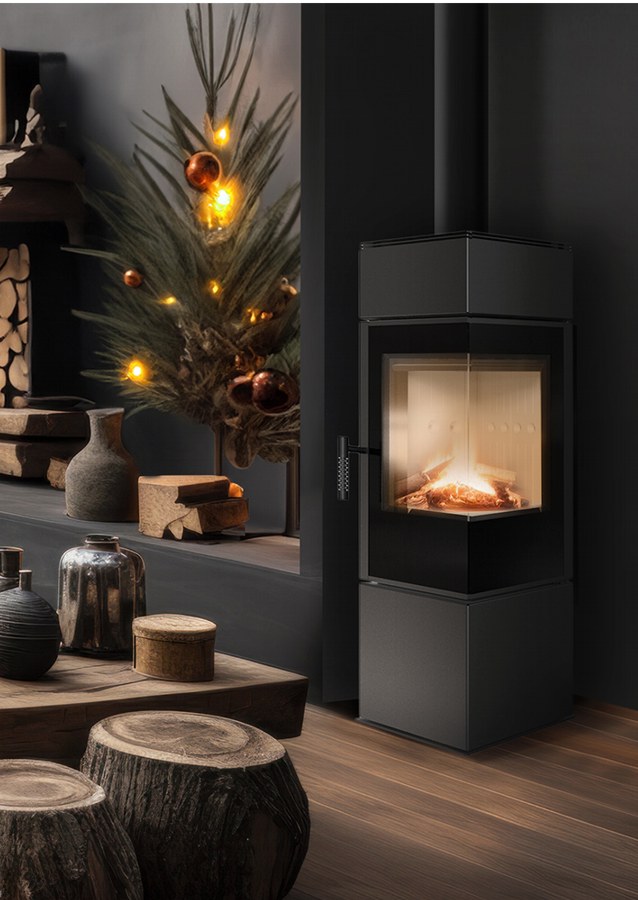 Terasest puuküttega kamin, millel on nurgaklaasiga uks. Kolle on vooderdatud tulekindla soojust salvestava materjaliga ACCUMOTE.