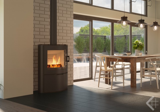 Terasest puuküttega kamin. Kolle on vooderdatud tulekindla soojust salvestava materjaliga ACCUMOTE.