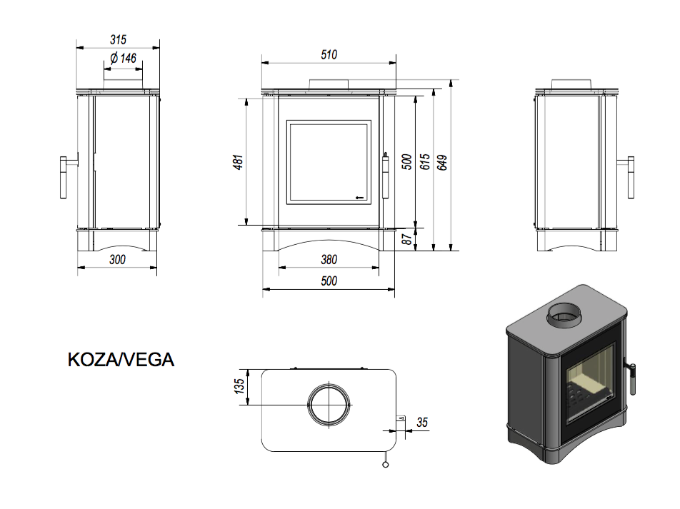 Terasest puuküttega kamin. Kolle on vooderdatud tulekindla soojust salvestava materjaliga ACCUMOTE. Kolde uks on kuumakindla serigraafilise klaasiga.