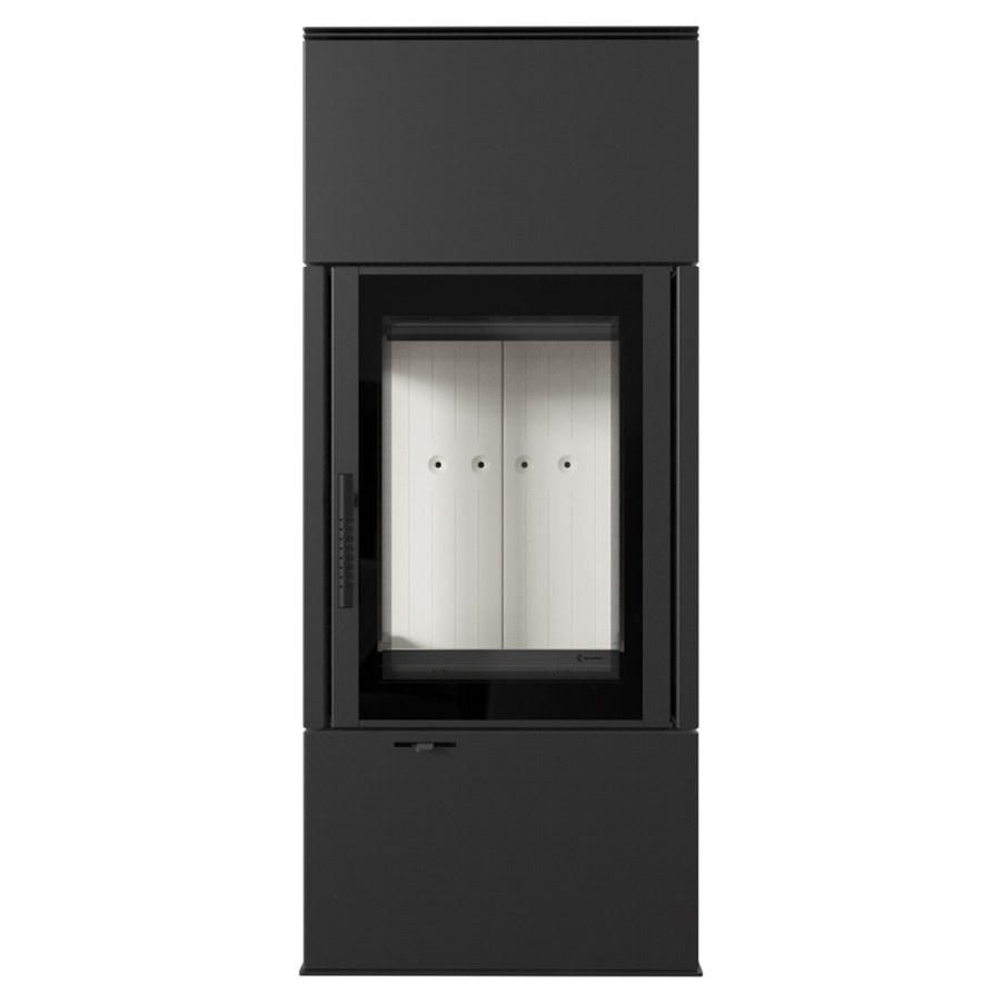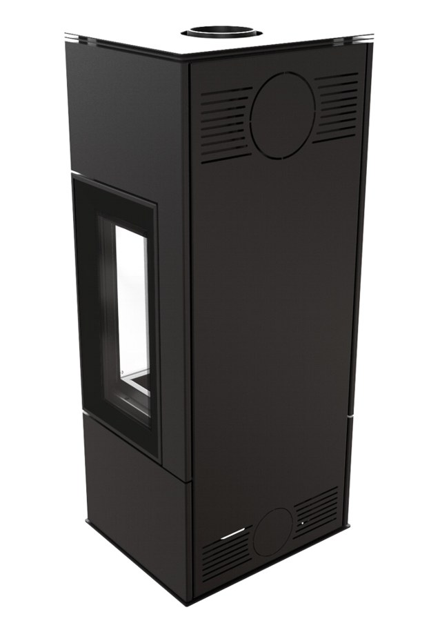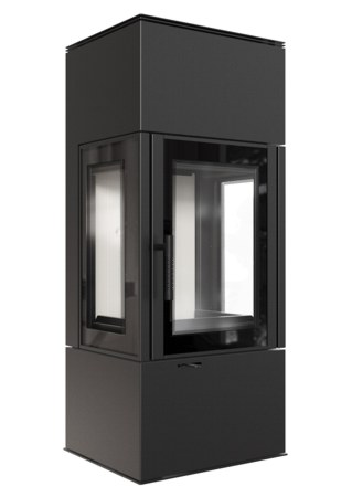 Terasest puuküttega kamin, millel on kaks küljeklaasi. Kolle on vooderdatud tulekindla soojust salvestava materjaliga ACCUMOTE.