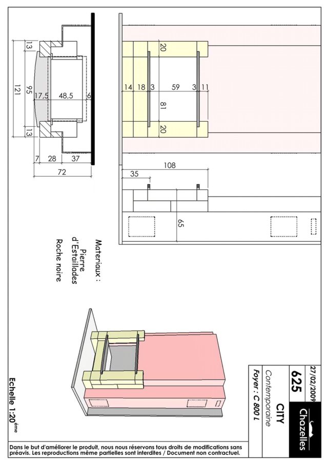 Kaasaegse välimusega kamin sirgele seinale. Kamin valmistatud kivist Estaillades ja riiulid mustast kivist.Koldena kasutatud malmist südamikku Chazelles C801L.