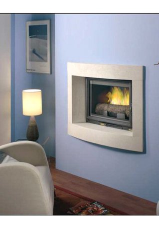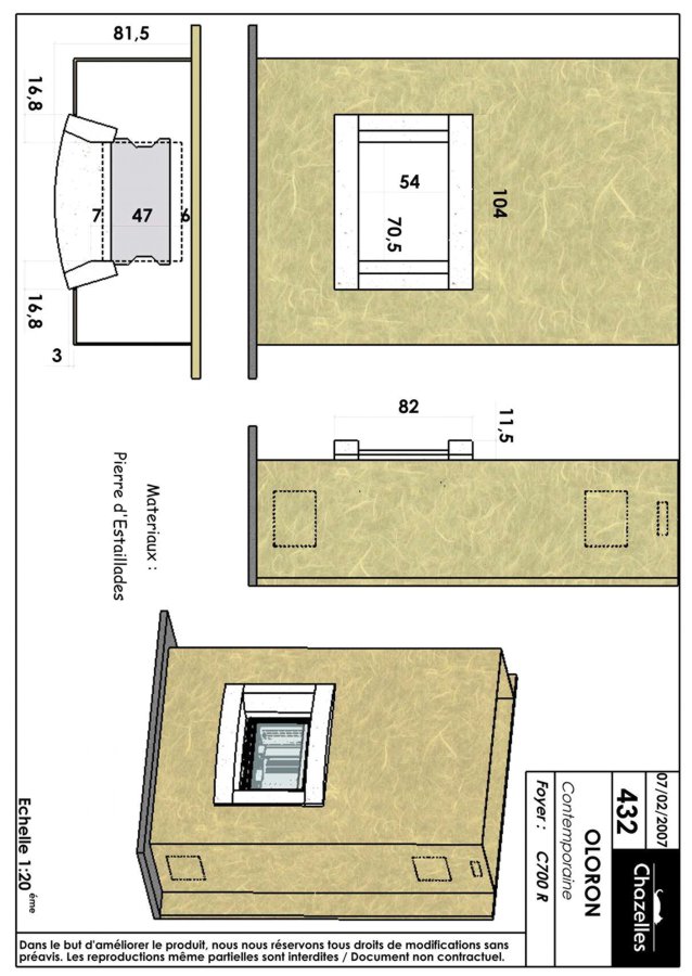 Kaasaegse välimusega kamin sirgele seinale. Kamina raam valmistatud kivist Estaillades.Koldena kasutatud malmist südamikku Chazelles C700.