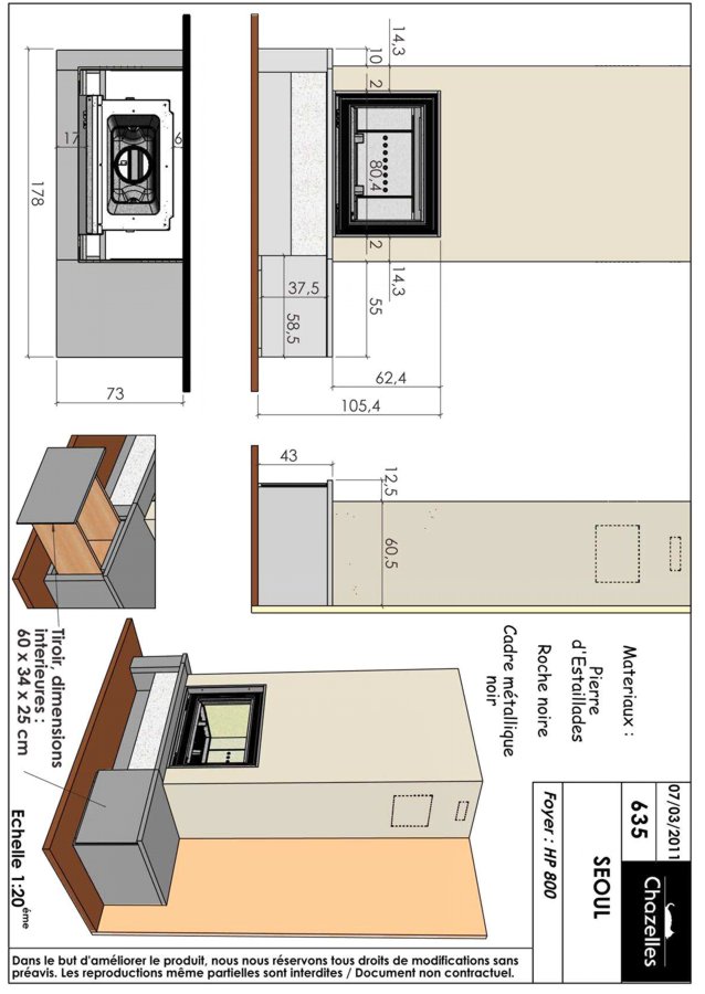 Kaasaegse välimusega kamin sirgele seinale. Kamin valmistatud kivist Estaillades ja mustast kivist. Südamiku ümber metallist raam.Koldena kasutatud malmist südamikku Chazelles HP800.