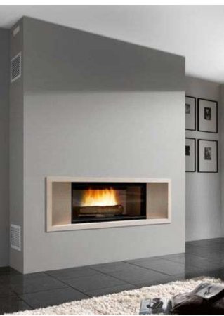 Kaasaegse välimusega kamin sirgele seinale. Kamina raam valmistatud kivist Chazelles.Koldena kasutatud terasest südamikku Chazelles E1200.