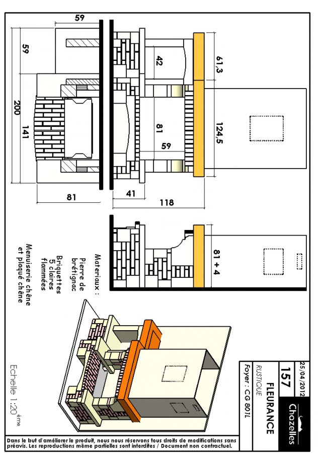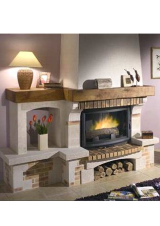 Maalähedase välimusega kamin sirgele seinale. Detaild valmistatud kivist Bretignac, dekoratiivtellisest. Komplekti kuulub tammest puitkarniis.Koldena kasutatud malmist südamikku Chazelles CG 801 L. Kaminast võimalik ka avatud koldega versioon. Üldised mõõdud: 2000 x 860 x 1170 mm