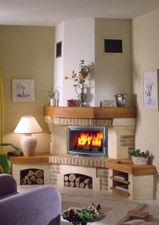 Maalähedase välimusega kamin nurka. Detaild valmistatud kivist Mauzens, dekoratiivtellisest.Komplekti kuulub tammest puitkarniis ja küljeriiulid.Koldena kasutatud malmist südamikku Chazelles CG 701 R.