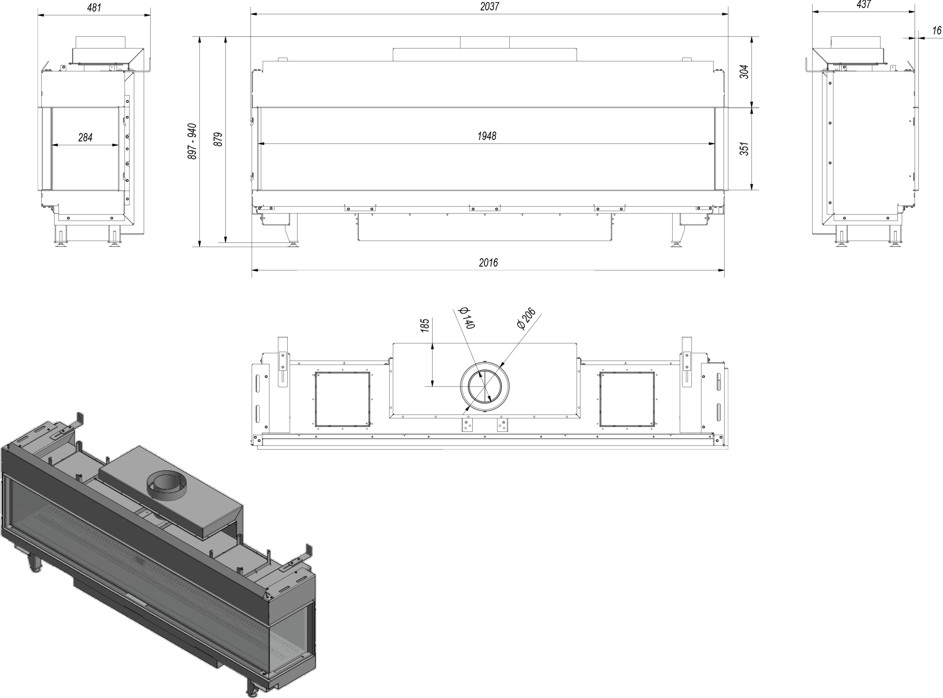 Horisontaalse kujuga gaasil töötav küljeklaasiga kaminasüdamik. Kaminasüdamikku saab kas parempoolse või vasakpoolse küljeklaasiga.