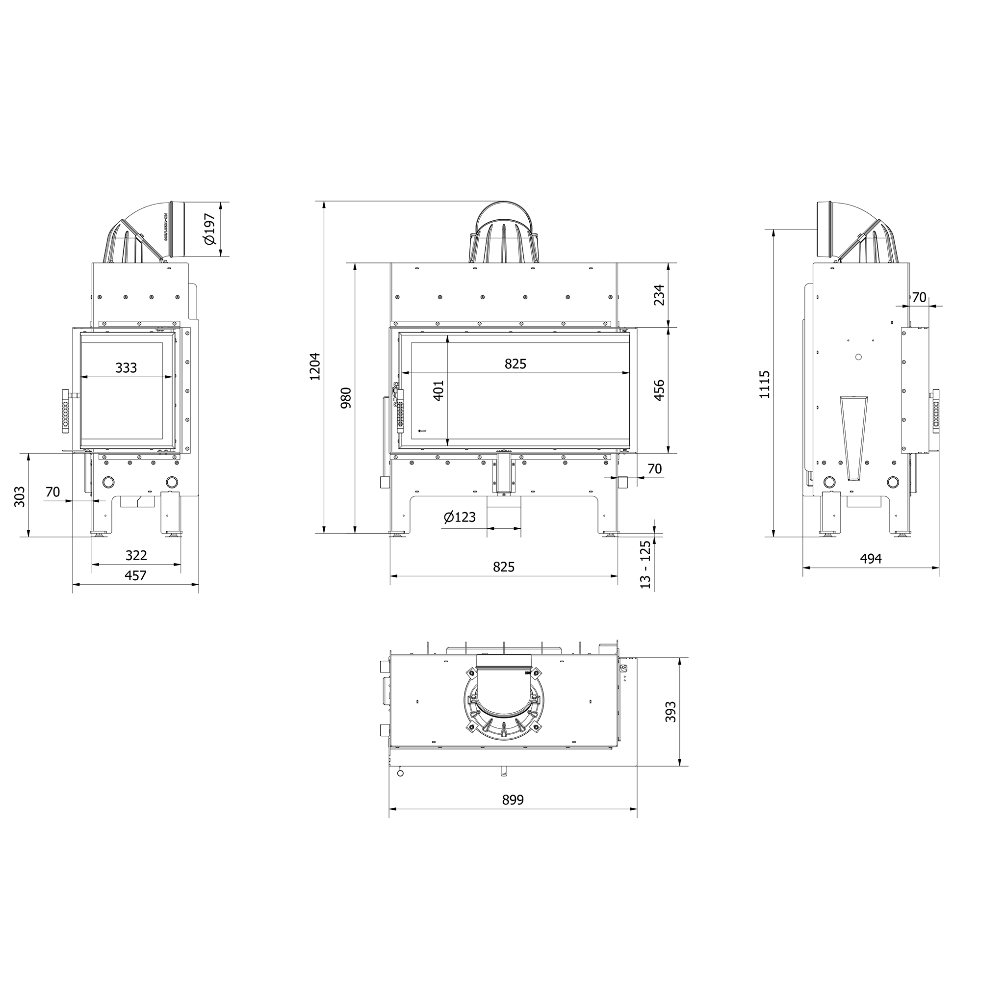 Kaminasüdamiku sisemise voodri värvi saab valida(valge või must). Südamik on varustatud reguleeritavate jalgadega, mis võimaldab toote lihtsat loodimist. Kaminasüdamik on varustatud välisõhuga ühendamise liitmikuga.