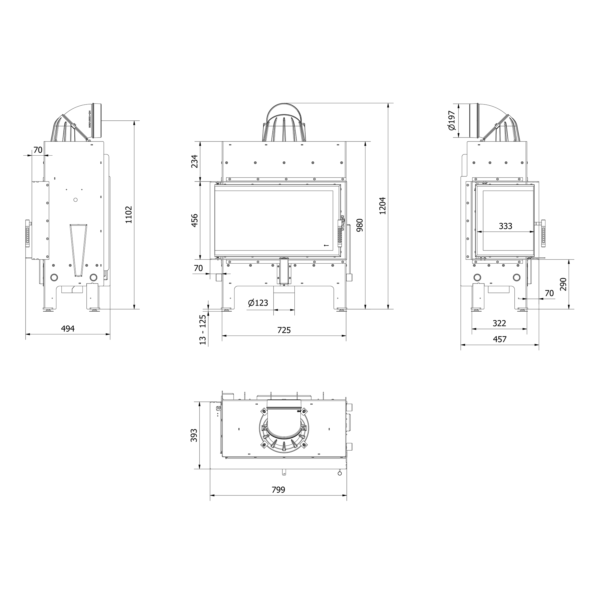 Kaminasüdamiku sisemise voodri värvi saab valida(valge või must). Südamik on varustatud reguleeritavate jalgadega, mis võimaldab toote lihtsat loodimist. Kaminasüdamik on varustatud välisõhuga ühendamise liitmikuga.