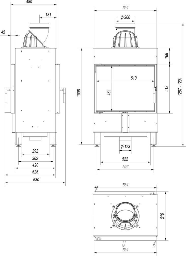 Südamik on varustatud reguleeritavate jalgadega, mis võimaldab toote lihtsat loodimist. Kaminasüdamik on varustatud välisõhuga ühendamise liitmikuga.