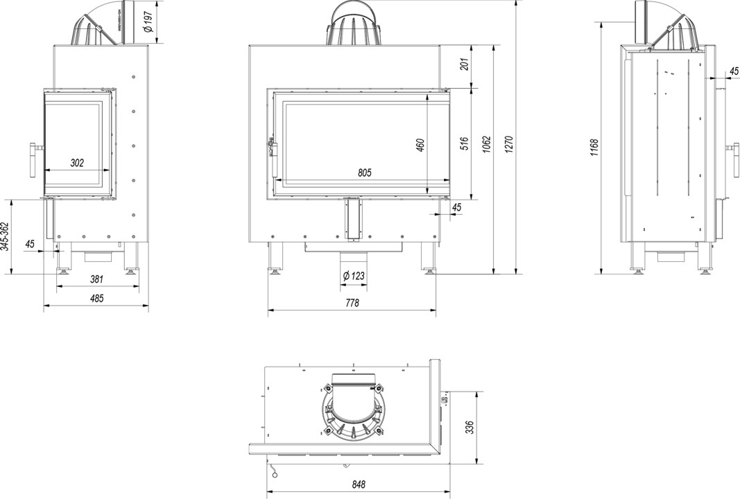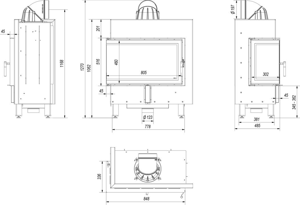 Südamik on varustatud reguleeritavate jalgadega, mis võimaldab toote lihtsat loodimist. Kaminasüdamik on varustatud välisõhuga ühendamise liitmikuga.