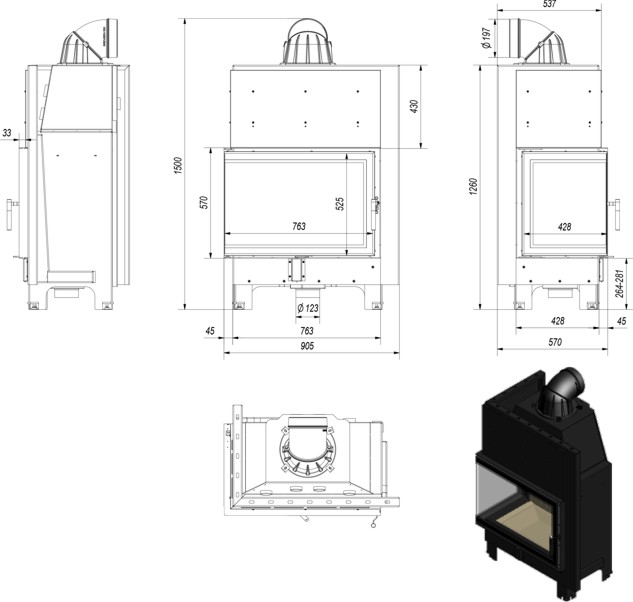 Terasest südamik küljele avaneva nurga klaasuksega. Kaminasüdamik on võimalik nii parempoolse, kui ka vasakpoolse küljeklaasiga. Kolle on vooderdatud tulekindla soojust salvestava materjaliga TERMOTEC. Südamik on varustatud reguleeritavate jalgadega, mis võimaldab toote lihtsat loodimist. Kaminasüdamik on varustatud välisõhuga ühendamise liitmikuga.