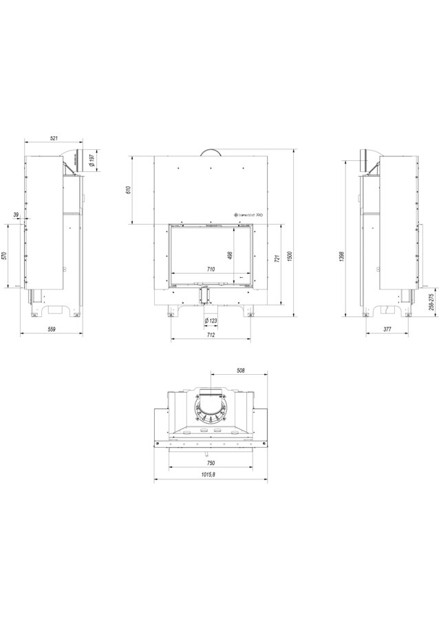 Südamik on varustatud reguleeritavate jalgadega, mis võimaldab toote lihtsat loodimist. Kaminasüdamik on varustatud välisõhuga ühendamise liitmikuga.