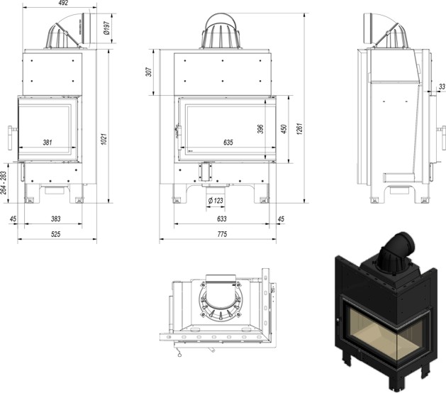 Terasest südamik küljele avaneva nurga klaasuksega. Kaminasüdamik on võimalik nii parempoolse, kui ka vasakpoolse küljeklaasiga. Kolle on vooderdatud tulekindla soojust salvestava materjaliga TERMOTEC. Südamik on varustatud reguleeritavate jalgadega, mis võimaldab toote lihtsat loodimist. Kaminasüdamik on varustatud välisõhuga ühendamise liitmikuga.