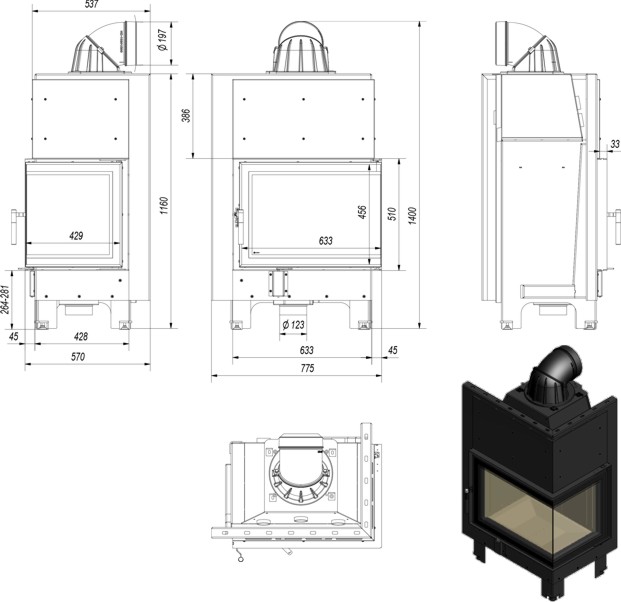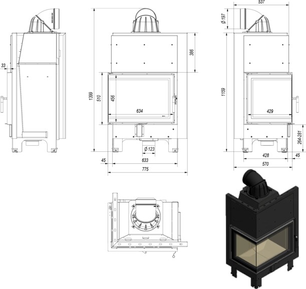 Terasest südamik küljele avaneva nurga klaasuksega. Kaminasüdamik on võimalik nii parempoolse, kui ka vasakpoolse küljeklaasiga. Kolle on vooderdatud tulekindla soojust salvestava materjaliga TERMOTEC. Südamik on varustatud reguleeritavate jalgadega, mis võimaldab toote lihtsat loodimist. Kaminasüdamik on varustatud välisõhuga ühendamise liitmikuga.