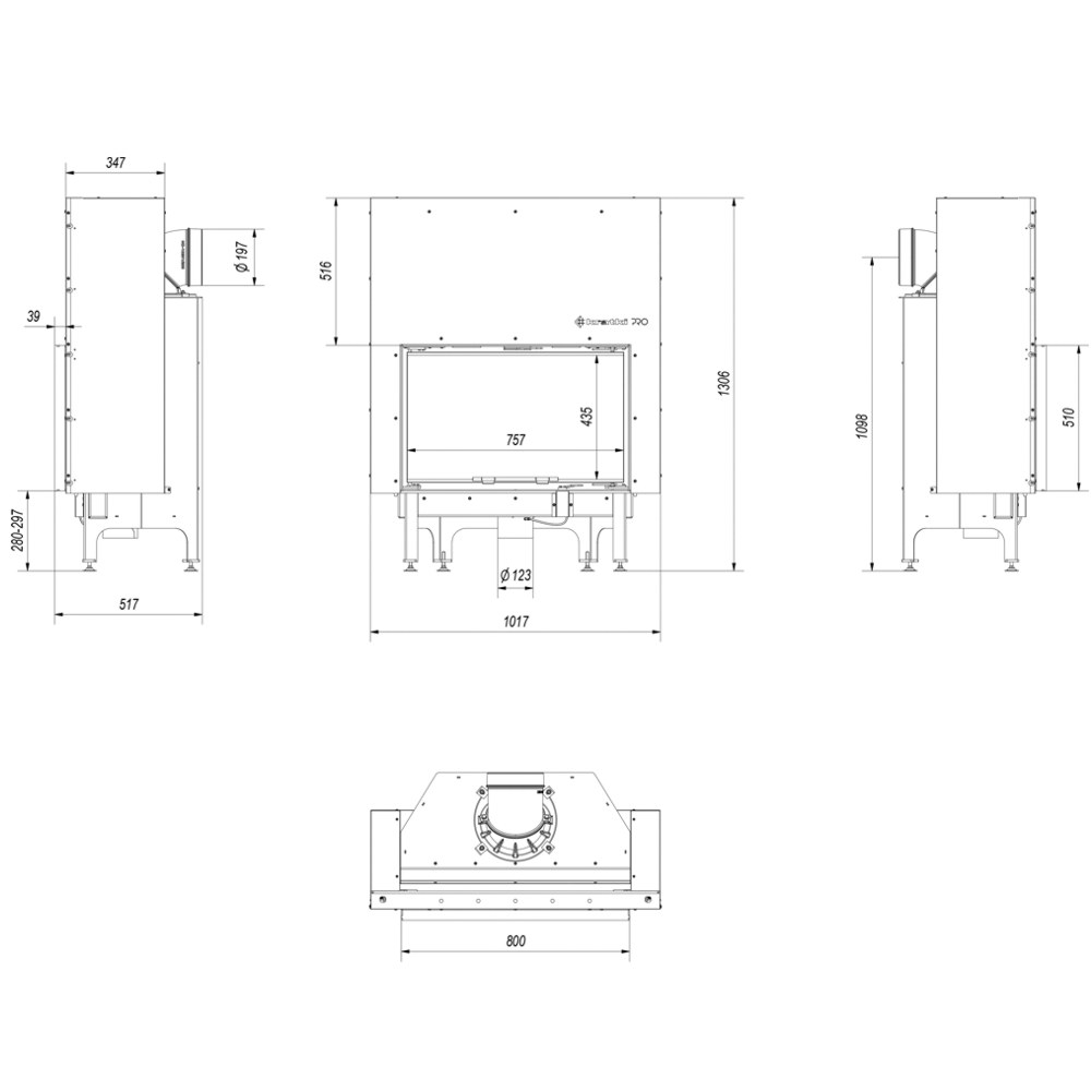 Südamik on varustatud reguleeritavate jalgadega, mis võimaldab toote lihtsat loodimist. Kaminasüdamik on varustatud välisõhuga ühendamise liitmikuga.