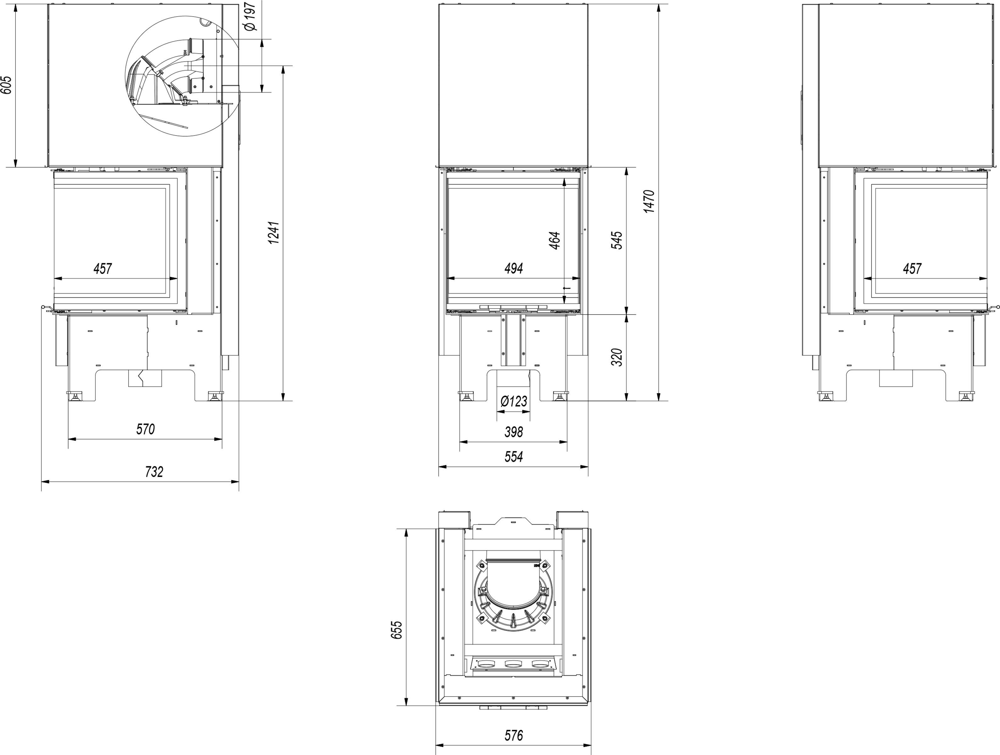 Südamik on varustatud reguleeritavate jalgadega, mis võimaldab toote lihtsat loodimist. Kaminasüdamik on varustatud välisõhuga ühendamise liitmikuga Ø125 mm.