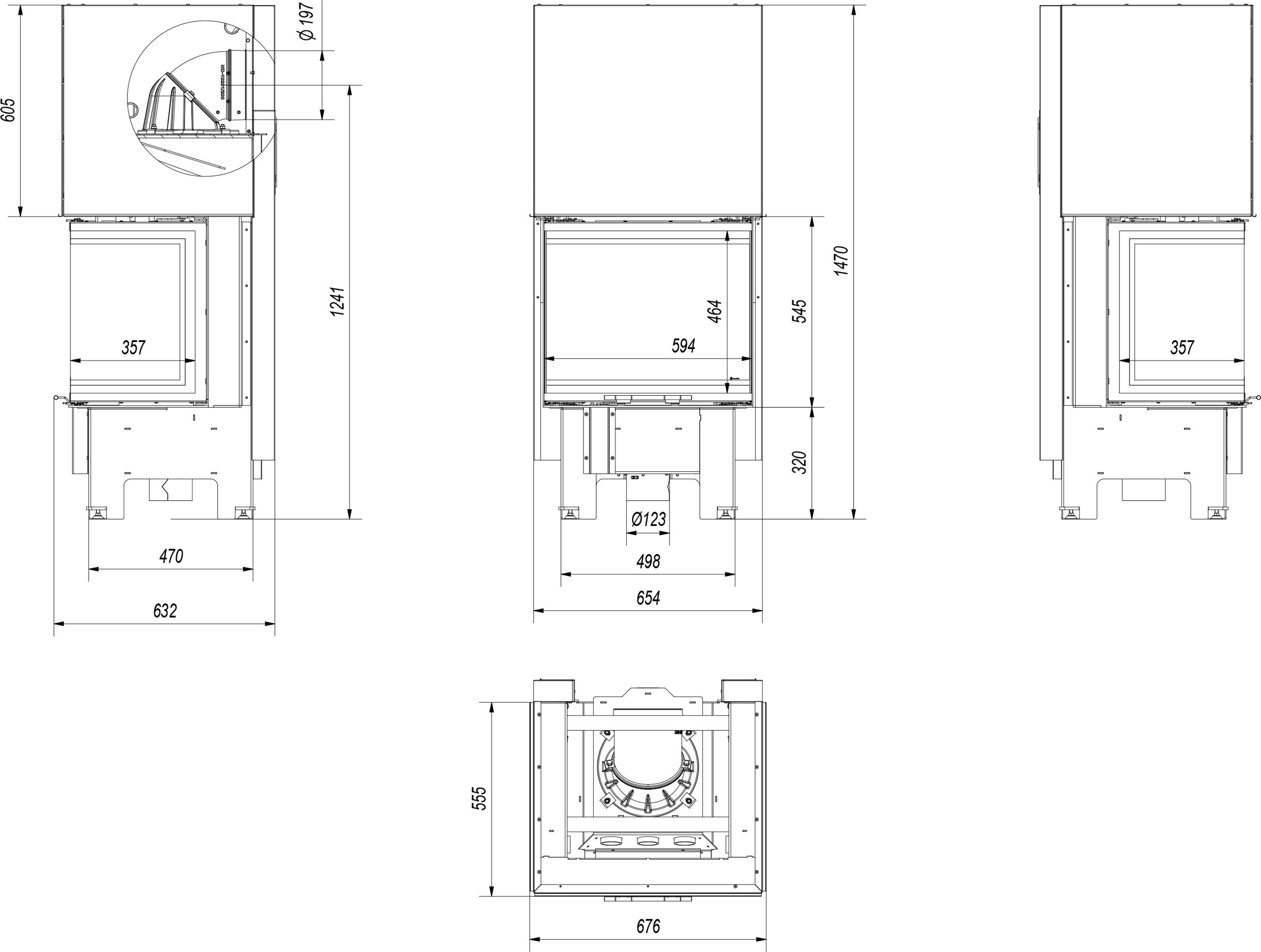Südamik on varustatud reguleeritavate jalgadega, mis võimaldab toote lihtsat loodimist. Kaminasüdamik on varustatud välisõhuga ühendamise liitmikuga Ø125 mm.