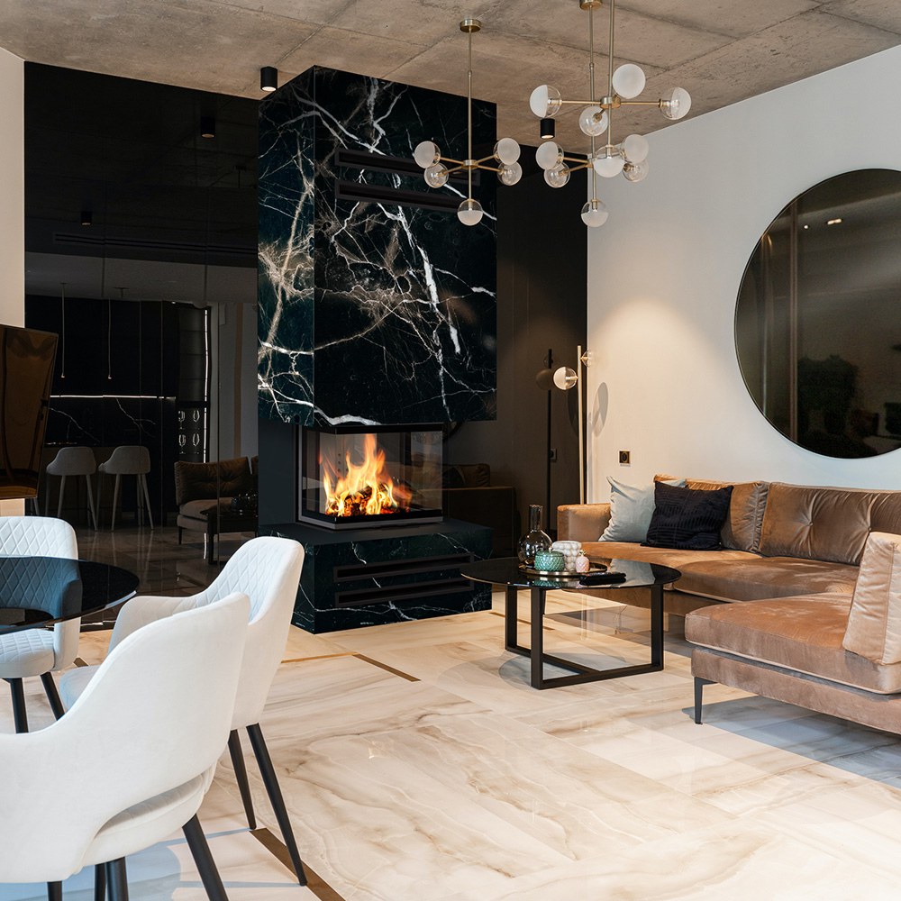 Kolme klaasiga terasest südamik tõstetava uksega. Südamiku sisemus on vooderdatud uuendusliku materjaliga TERMOTEC, mis on suurepäraselt kontrastiks kaminaga, andes sellele kaasaegse disaini. TERMOTEC on keraamiline materjal, mis akumuleerib soojust ja tõstab kolde temperatuuri