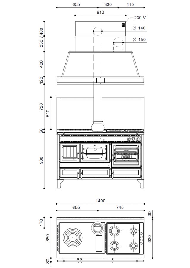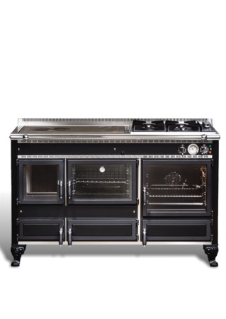 Suur puuküttega kolle kombineeritud puidul köetava praeahju, suurepärase 53-liitrise multifunktsionaalse elektriahju ja poolproffessionaalse pliidiplaadiga