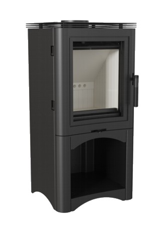 Terasest puuküttega kamin. Kolle on vooderdatud tulekindla soojust salvestava materjaliga ACCUMOTE, kolde põhi ja uks on malmist.