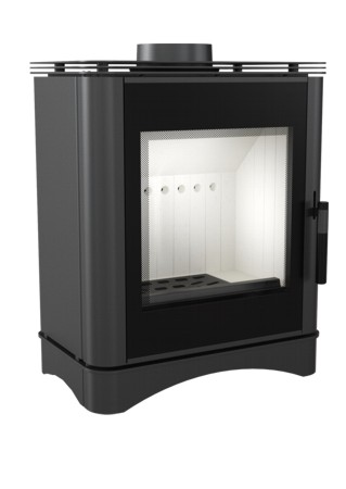 Terasest puuküttega kamin. Kolle on vooderdatud tulekindla soojust salvestava materjaliga ACCUMOTE. Kolde uks on kuumakindla serigraafilise klaasiga.